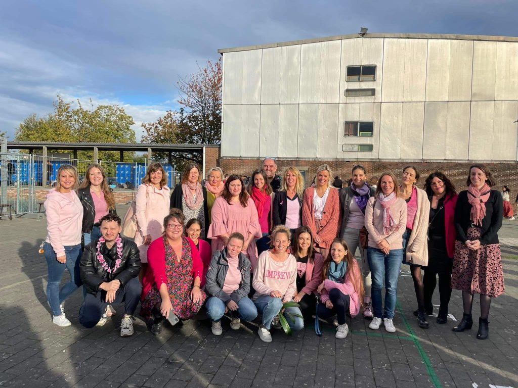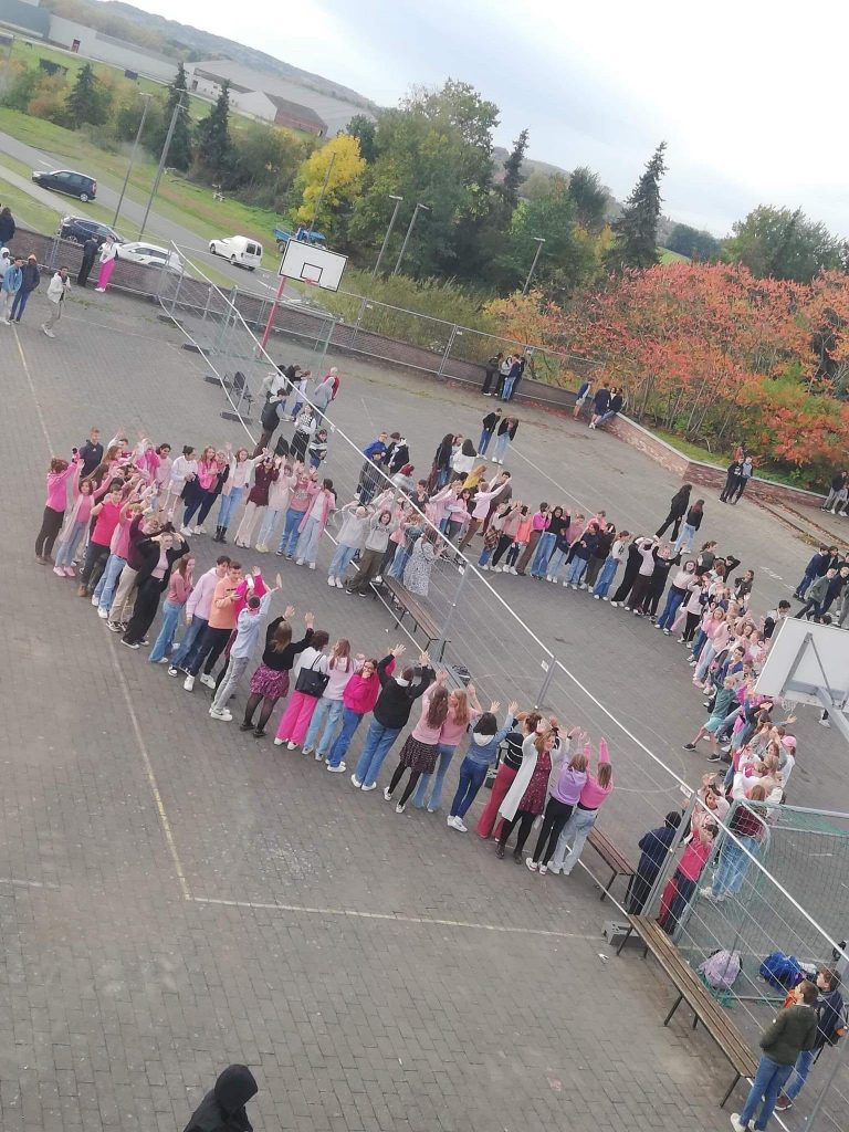 Le mois d’octobre est le mois de sensibilisation au cancer du sein. En soutien aux personnes touchées par cette maladie, les élèves et les membres du personnel ont été invités à porter une touche de rose à l’initiative de Mesdames Hyntens et Wandels, professeurs de français et de morale.