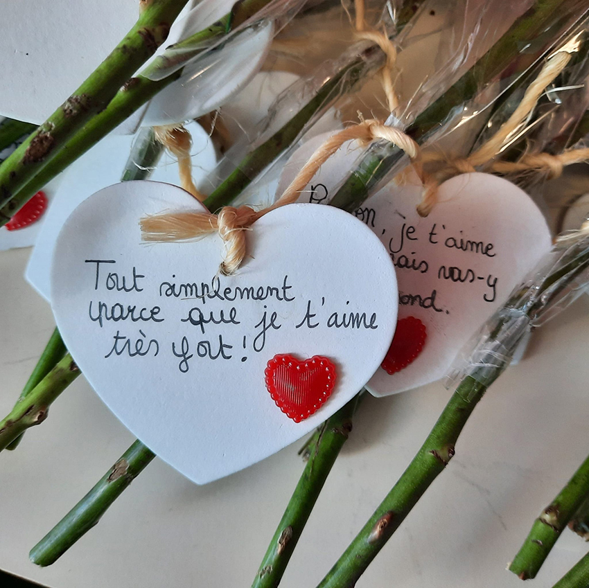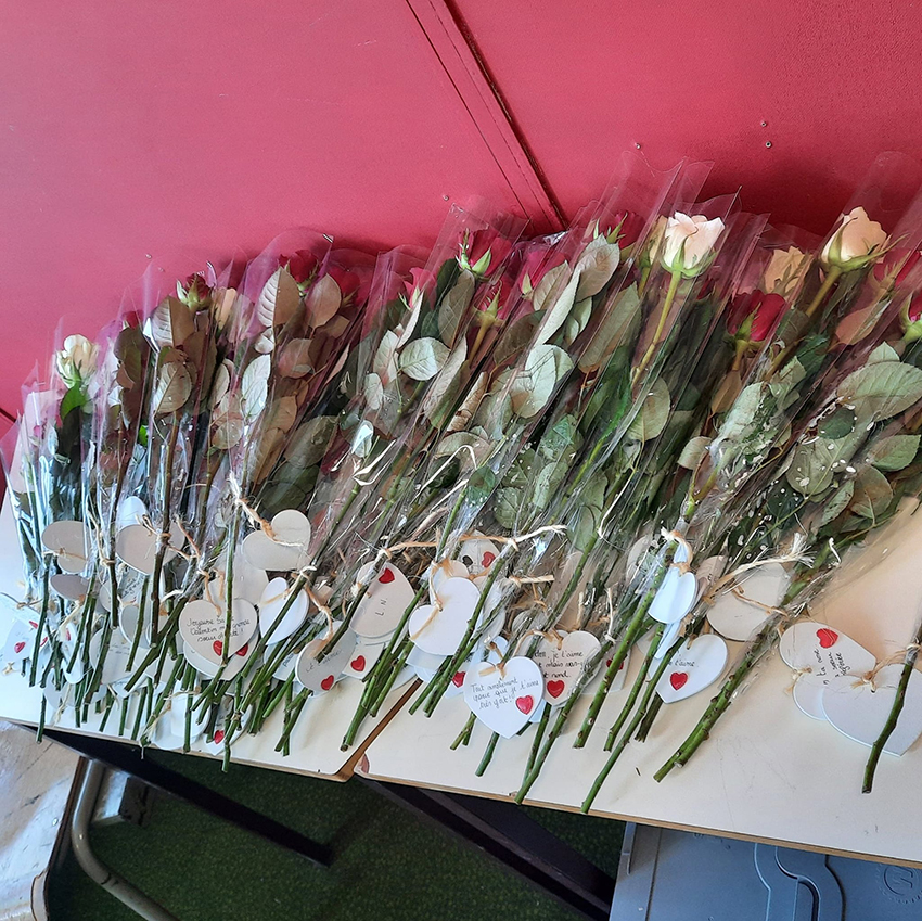 Action Saint Valentin organisée par nos rhétos : ils ont vendu des roses pour financer leur voyage en permettant aux acheteurs d’y accrocher un mot doux