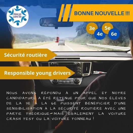 Bonne nouvelle ! Nous avons répondu à un appel et notre candidature a été retenue pour que nos élèves de la 3e à la 6e puissent bénéficier d’une sensibilisation à la sécurité routière avec une partie théorique mais également la voiture crash test ou la voiture tonneau !