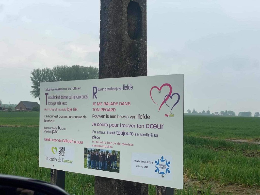 Cet après-midi se déroulait l’inauguration des nouvelles œuvres placées sur le sentier de l’amour à Anvaing. Nos élèves de 2e, 3e et 4e ont participé à ce projet original et inspirant. Avec l’aide de leurs professeurs de français et de néerlandais, Mmes Bachler, Lecomte et Werbrouck, ils ont rédigé des phrases courtes sur le thème de l’amour. Ces phrases ont été imprimées sur des panneaux installés le long du sentier de l’amour. Les élèves ont pris plaisir à écrire des phrases personnelles et originales. Ils ont également appris à travailler en équipe et à respecter les règles de grammaire et d’orthographe. Ils ont utilisé trois langues : le français, le néerlandais et l’anglais. Ce projet leur a permis de mettre en pratique leurs connaissances dans ces langues. C’est également une occasion pour eux de découvrir leur environnement et de contribuer à la beauté de leur village.