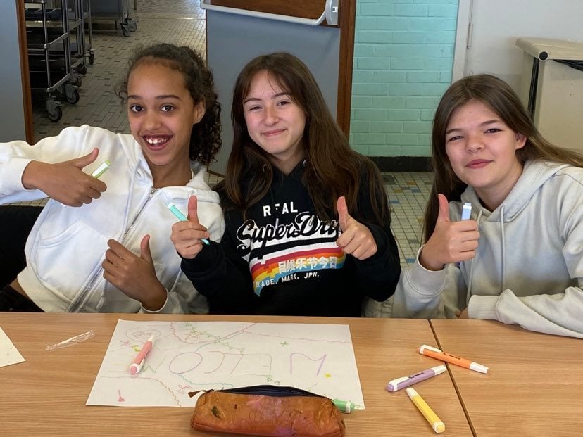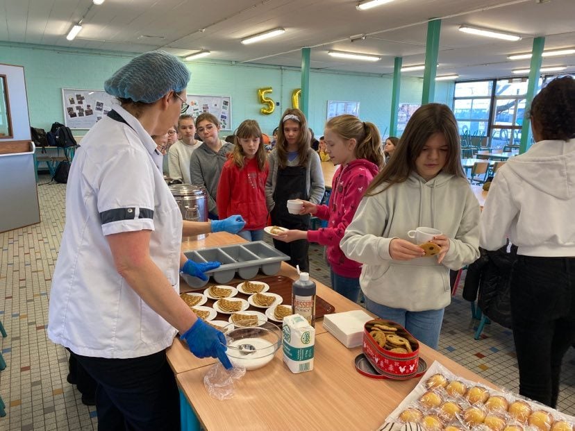 Ce matin, certains élèves de première année ont accueilli Liza, qui vient d’Ukraine, lors d’un petit déjeuner / drink d’accueil pendant le cours de citoyenneté de Mme Disy. Charlotte avait préparé un gâteau pour l’occasion et Célestine des cookies au chocolat ! Les élèves se sont présentés et lui ont écrit quelques mots pour lui souhaiter la bienvenue.